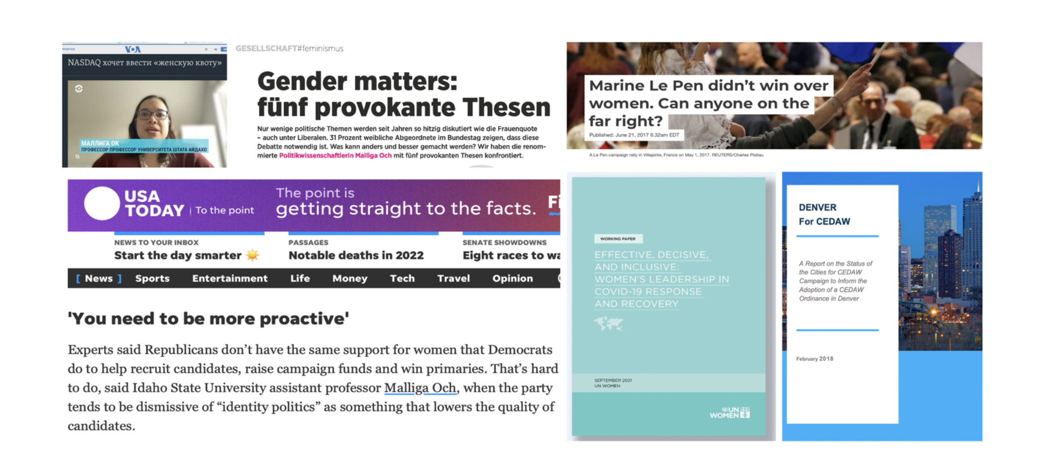 My research projects strive to be ‘actionable research’ in the sense that my research findings should provide valuable insight and guidance to political practitioners. Beyond academic outlets, I publish my research in media outlets and popular press to reach political and social stakeholders outside the academic community and share my expertise on radio and television. I have co-authored a working paper for UN Women and a policy analysis for the City and County of Denver. I have published my research in domestic and international media outlets including but not limited to Ms Magazine, The Conversation, the Huffington Post, Liberal – Das Magazin, and Australian Outlook; I have been quoted as an expert in USA Today, the Philadelphia Inquirer, China Global Television Network, Nikkei News; and I have appeared as an expert on women’s political representation on local news, webinars for UN Women, Voice of America, and I was the co-host for “Know Your Media” (KISU public radio).